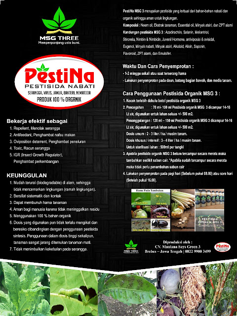 Pestisida organik dari MSG 3 ini merupakan pestisida yang dibuat dari ekstrak berbagai macam tumbuhan seperti cengkeh, serai, minyak atsiri, tanaman neem, zpt alami, dll. Pestida dibuat dari 100% bahan organik sehingga aman untuk lingkungan dan tidak meninggalkan residu.